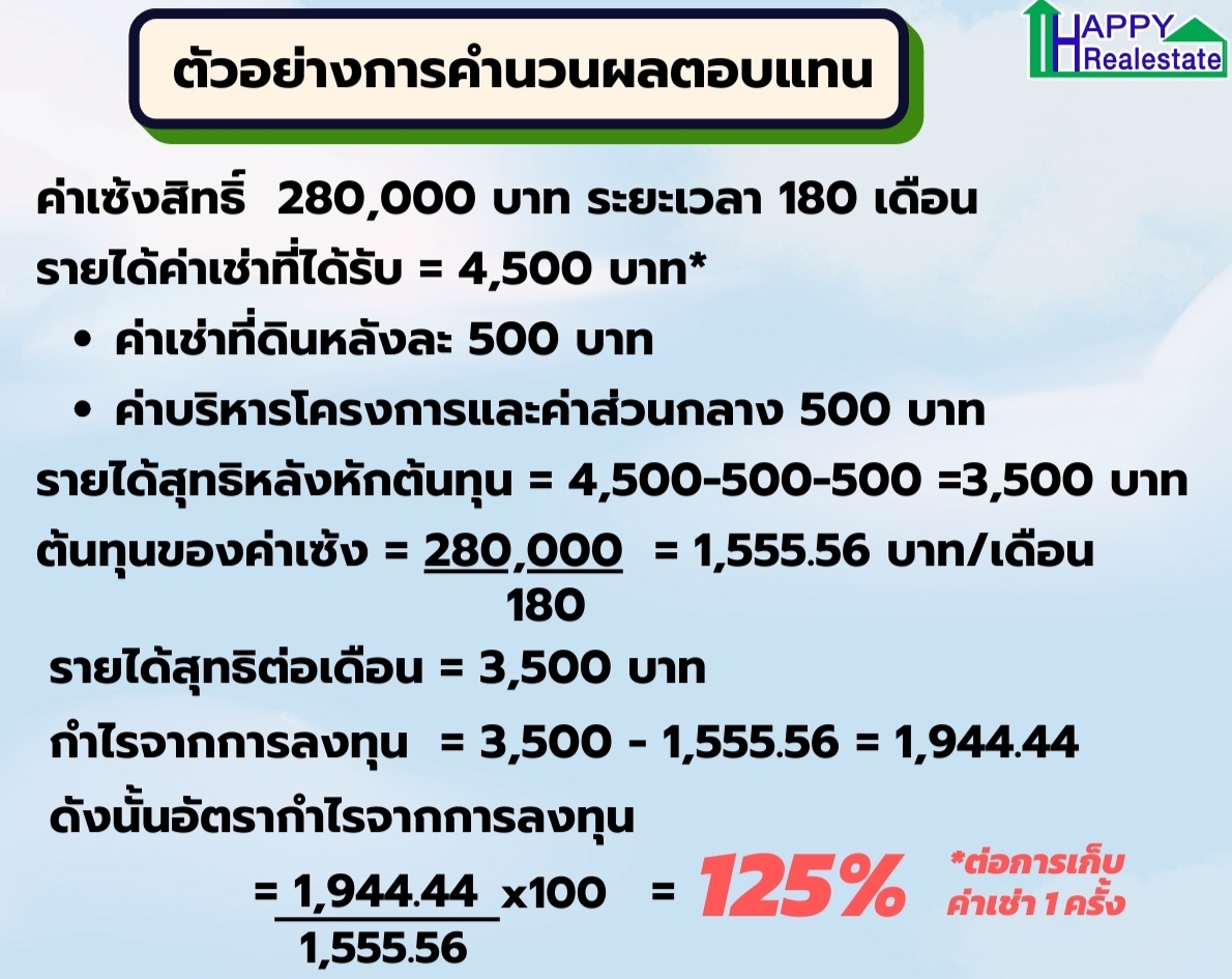 Happy realestate เปิดโอกาสให้นักลงทุนเข้ามาร่วมธุรกิจด้วยการเซ้งสิทธิ์บ้านให้เช่า ซึ่งเป็นทางเลือกที่น่าสนใจสำหรับผู้ที่ต้องการลงทุนในอสังหาริมทรัพย์ แต่ไม่ต้องรับภาระในการซื้อที่ดินหรือพัฒนาโครงการใหม่ นักลงทุนสามารถเซ้งสิทธิ์บ้านให้เช่าและได้รับผลตอบแทนจากการปล่อยเช่าระยะยาว โดยไม่ต้องกังวลเกี่ยวกับต้นทุนที่ดินและค่าใช้จ่ายในการพัฒนาอสังหาริมทรัพย์ โอกาสนี้จึงเป็นทางเลือกที่เหมาะสำหรับผู้ที่ต้องการกระจายความเสี่ยงและสร้างรายได้อย่างมั่นคง.
